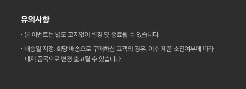 - • 배송일 지정 및 희망배송으로 구매하신 고객의 경우, 이후 재고 소진여부에 따라 대체 품목으로 변경 출고될 수 있습니다.